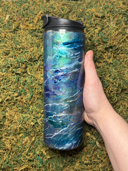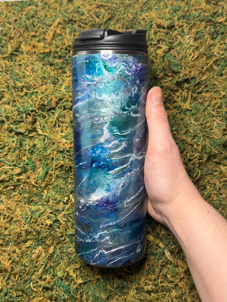 18 OZ skinny tumbler. (Stainless Steel). Includes one dual lid (sliding and hydro) and reusable plastic straw. Suited for hot or cold beverages.