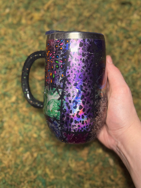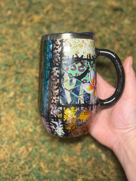 16 OZ mug tumbler. (Stainless Steel). Includes lid and reusable plastic straw. Suited for hot or cold beverages.