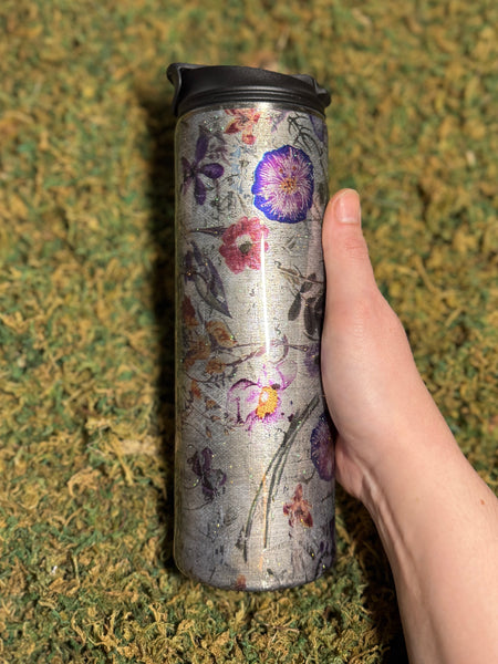 18 OZ skinny tumbler. (Stainless Steel). Includes one dual lid (sliding and hydro) and reusable plastic straw. Suited for hot or cold beverages.
